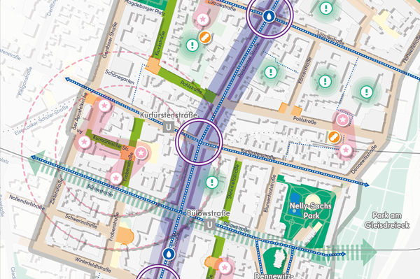 Die Potsdamer Straße ist eine besondere Berliner Magistrale. Unter Beteiligung der Bürger:innen entwickelten wir ein integriertes Konzept zur Stärkung des Zentrums, nachbarschaftlicher mit Strategien zu Verkehrswende und Klimaanpassung.